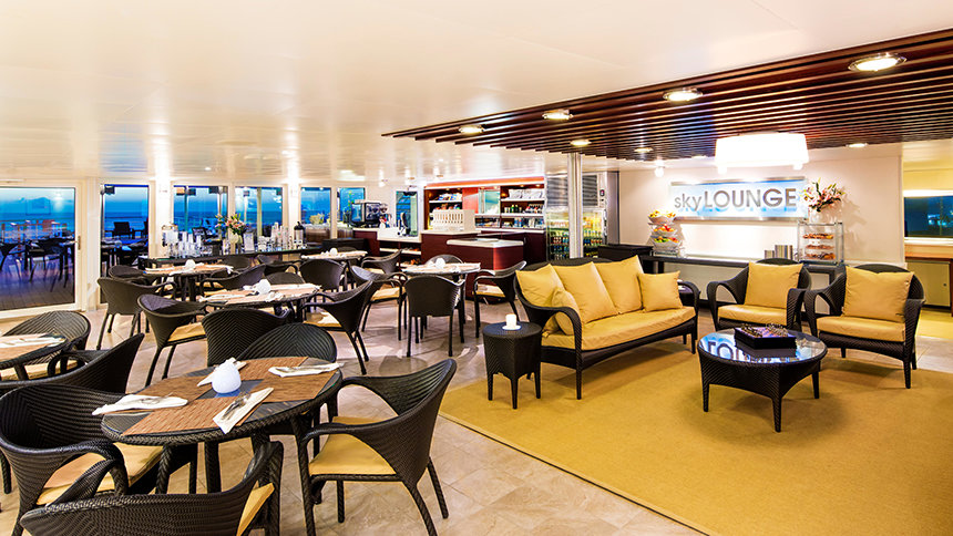 SKY LOUNGEThe Sky Lounge is an informal gathering place for snacks and meals throughout the day or after an evening Freewinds event.