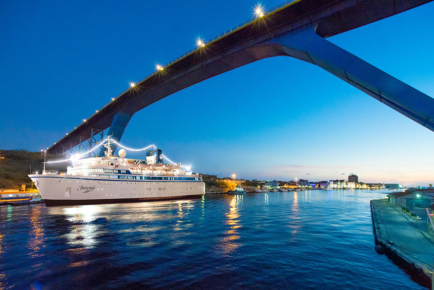 The Freewinds at dock below the Queen Juliana Bridge in her home port at Willemstad, Curaçao. The location is steeped in Scientology history, for it was also here, in 1974, that L. Ron Hubbard docked the Sea Organization flagship Apollo.