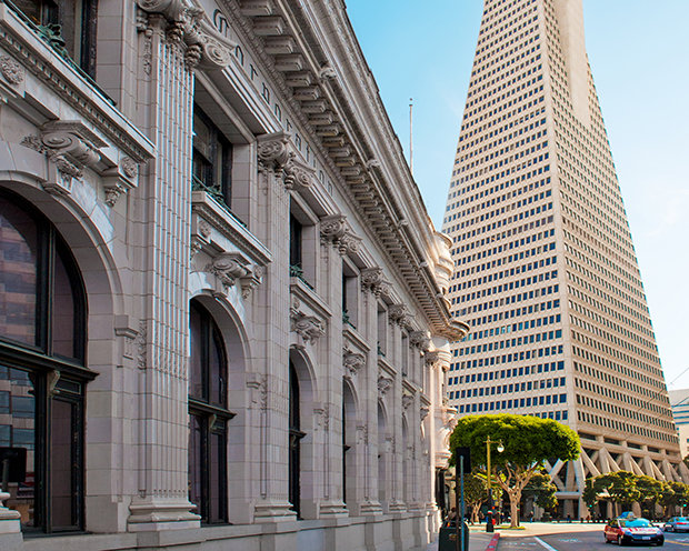 The original Transamerica Building, now home of the Church of Scientology of San Francisco, stands adjacent to the Transamerica Pyramid and is a registered historical landmark and prominent feature of the Jackson Square Historic District.
