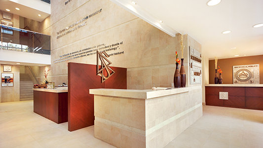 The entrance and reception area—in a modern Aztec motif—welcomes those of all religions and cultures, as well as Mexico City’s growing Scientology congregation and their guests.