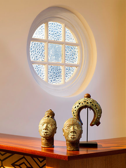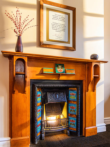 AMONG THE HISTORICAL FEATURES the Church restored in the heritage homes is this cast-iron fireplace with its carved hardwood mantel and ceramic tiles of South Africa’s abundant proteas and hibiscus.