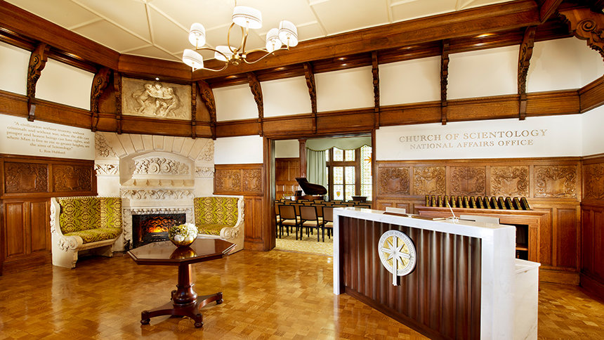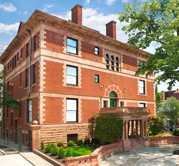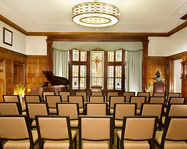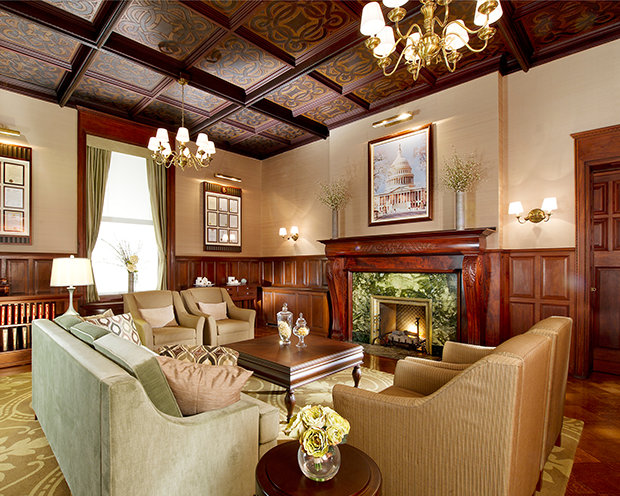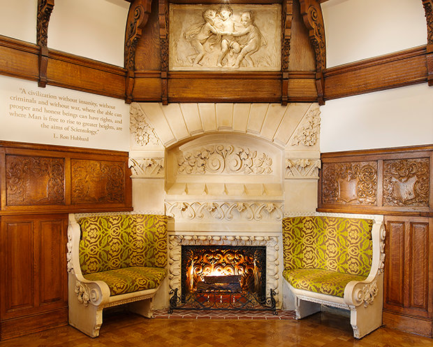 Among the many architectural elements the Church meticulously restored in Fraser Mansion is the reception’s ornate white marble fireplace with attached settees and intricately carved floral motif mantel and frieze.