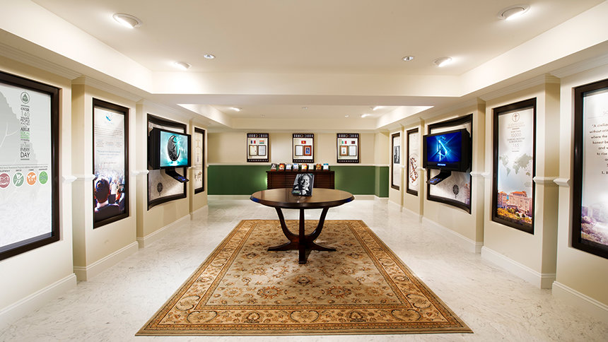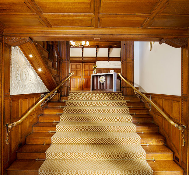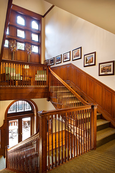 Among the most notable features of the Fraser Mansion is this grand staircase, with its rare, fine-grained oak and mahogany, and intricately carved balustrades fully restored by the Church.