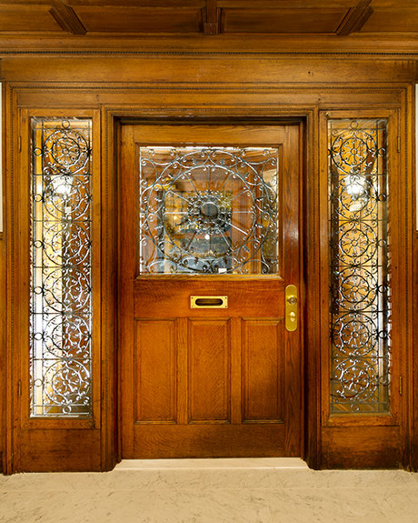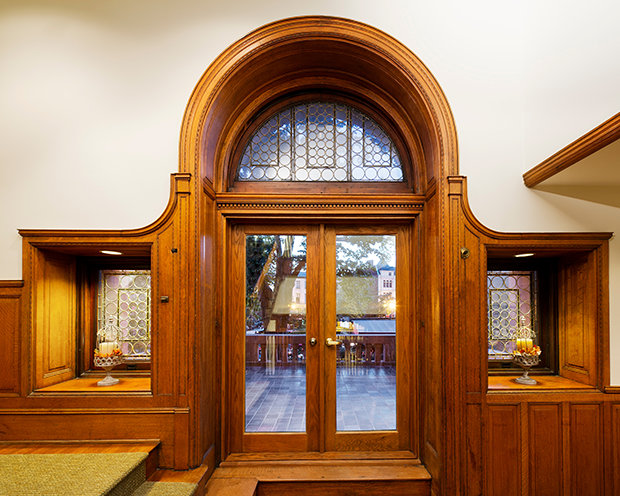 The Fraser Mansion entrance foyer’s paneled oak doors and leaded glass windows are restored to their original late-nineteenth-century splendor.