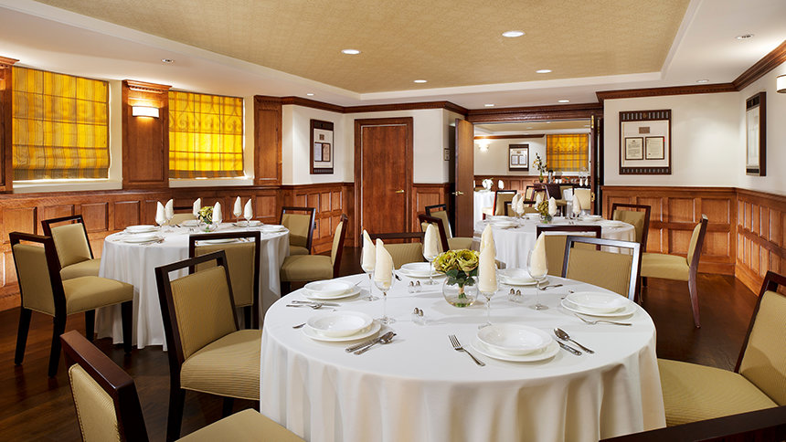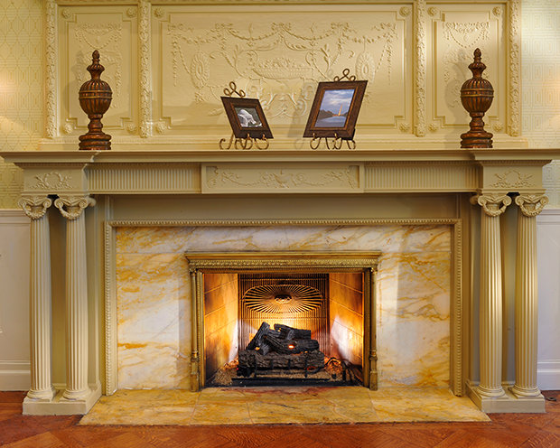 The Fraser Mansion Pennsylvania Room includes an historic fireplace of hand-carved yellow marble, supported by fluted Ionic columns and crowned by an ornate floral motif overmantel. It is one of the 14 fully restored fireplaces in the landmark home, each featuring a distinct variety of marble or granite with a unique and ornate mantel of wood or stone.