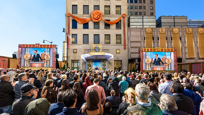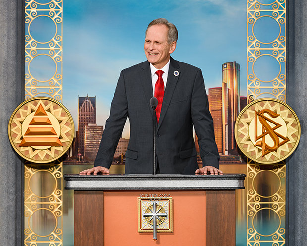 開幕慶典的背景是這棟八層樓高的Scientology教會,就位在西傑弗遜大道150號的摩天大樓東方,底特律的哈特廣場就位在它的正對面。 其所在位置是真正的基石,這裡是鵬查特蘭堡的第一棟建築所在地,鵬查特蘭堡後來改名為底特律。 為這個故事再添深義的,是這棟最早的建築,同時也是這座城市的第一間教會,於1701年建造。
