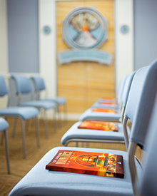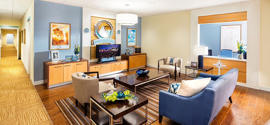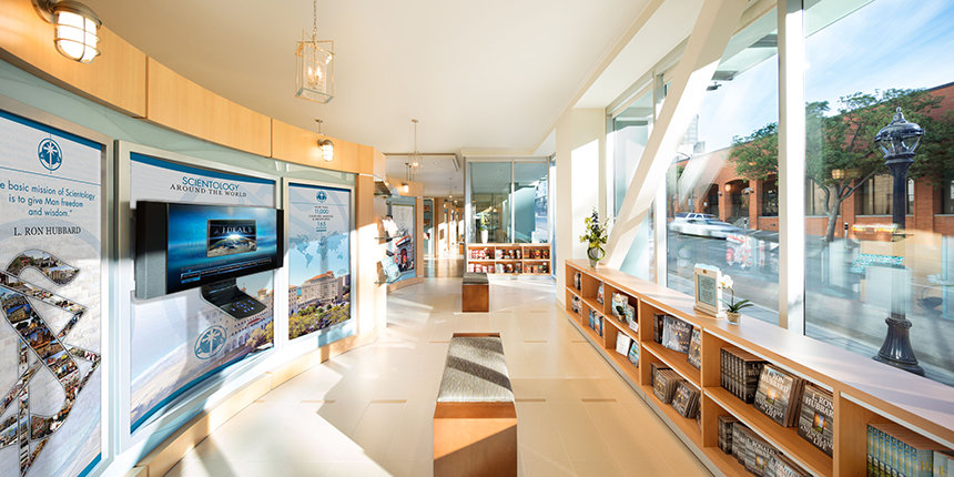 新聖地牙哥教會為訪客介紹戴尼提與山達基,首先映入眼簾的是大眾資訊中心。這裡的展示版包含500多部短片,全方位呈現山達基宗教的信仰和實踐,以及創始人L. 羅恩 賀伯特的生平與傳承。