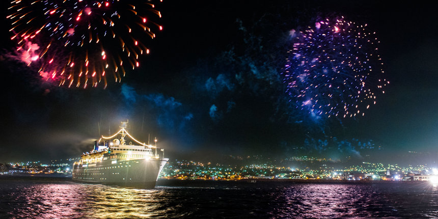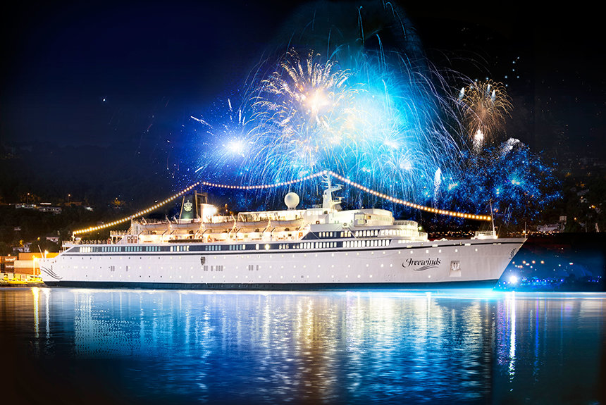 6月14日晚上,當燦爛的煙火綻放在聖基茨島的同時,山達基自由風之船展開了銀色週年紀念的航行。