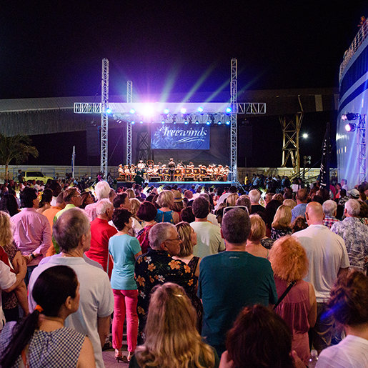 乘客們於6月15日星期五,紛紛抵達巴貝多的布里奇敦,一艘閃亮的白色、九層甲板,長440英尺的機動船正在岸邊歡迎他們的到來。 傍晚過後,在晚上六點,共有250多位全球最致力奉獻的山達基人聚集在碼頭邊或靠著甲板欄杆,享受微風的吹拂。 空氣中充滿期待,巴貝多皇家警察樂隊的鼓聲打斷了溫和微風的吹拂,以及當地達官顯要的祝福話語。 自由風之船調轉艦首,設定航程朝大海前進,令人讚嘆的煙火照亮了布里奇敦的夜空,慶祝自由風的30週年慶。