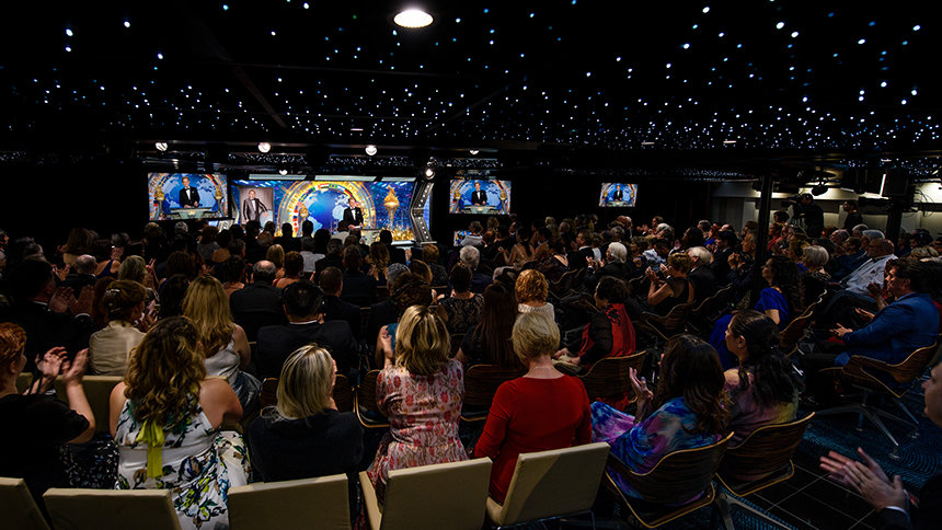 每年前來參加晚會的大眾聆聽簡報,內容詳細說明我們宗教前所未有的擴展運動,而今年的晚會證明了這是最令人興奮的一年。