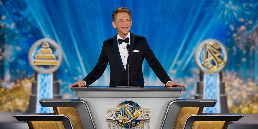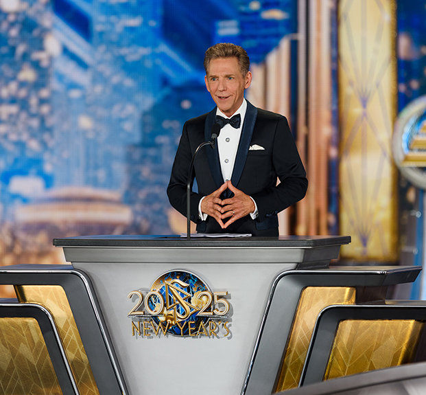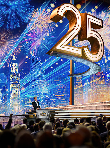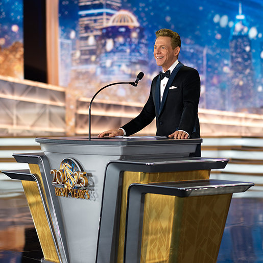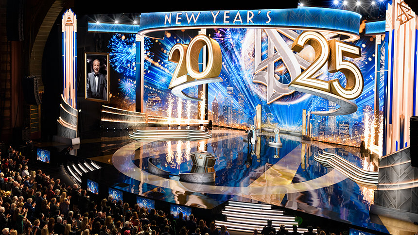 一場眾星雲集的音樂會為這場盛會拉開序幕,樂聲讓觀眾們紛紛起立,手舞足蹈。舞台四周環繞著燦爛的燈柱,接著一個巨大的2025從屋頂上緩緩降落,一切都讓觀眾們期待不已。