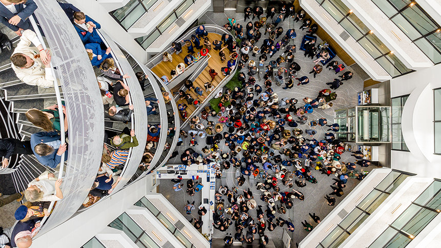 除了閃閃閃發光的外部,還要加上現代幾何圖案拼湊而成的木製入口,這棟設施高聳的中庭呈現紅杉樹迷人的樣貌。「年輪」一圈圈地鑲嵌在磨石子地板上,環狀的欄杆扶手,就像是從紅杉樹伸展出來的葉子一樣。當訪客在這座15公尺高的空間中蜿延向上時,上方的天井讓他們沉浸在天然的光線中。